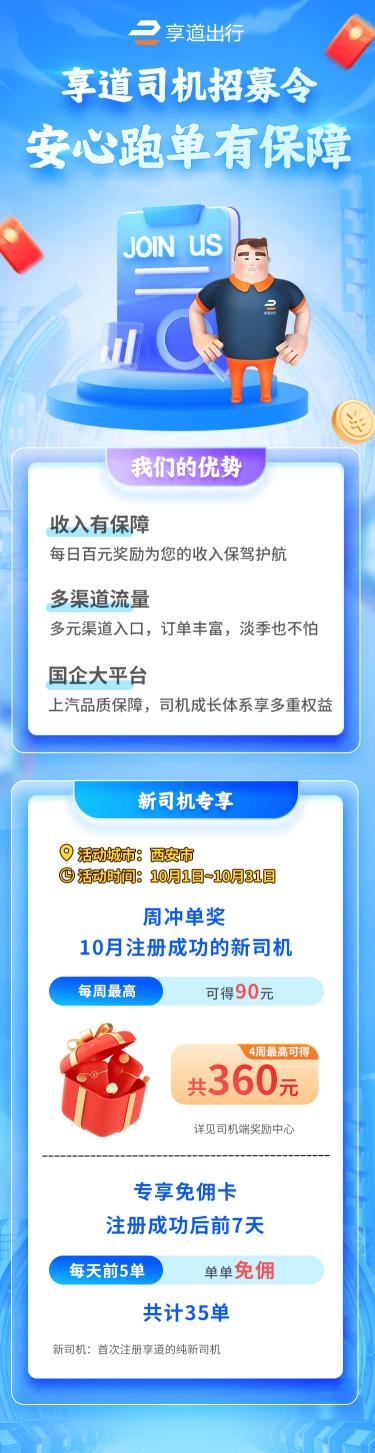 上汽集团移动出行战略品牌享道出行在全国各运营城市启动司机招募工作,以多重优惠活动邀请志同道合的司机朋友们加入。在西安,享道出行推出10月新司机专享奖励活动,让新司机安心跑单有保障。